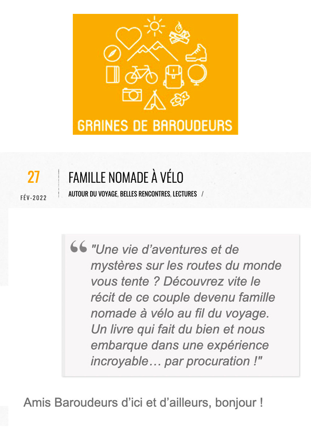 Céline et Xavier sont des nomades à vélo, sur les routes du monde depuis 10 ans. Ils explorent avec leurs filles, Nayla et Fibie, les somptuosités des recoins sauvages de la planète, ils plongent dans des cultures aussi variées qu’intrigantes. Plus qu’une vie d’aventure, ils semblent appelés par les lieux, guidés par le mystère. Chaque jour, ils ouvrent la toile de leur tente pour un nouveau commencement et plongent dans l’inconnu à l’écoute de leurs intuitions et portés par leur indéfectible confiance en la vie.