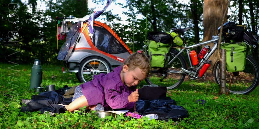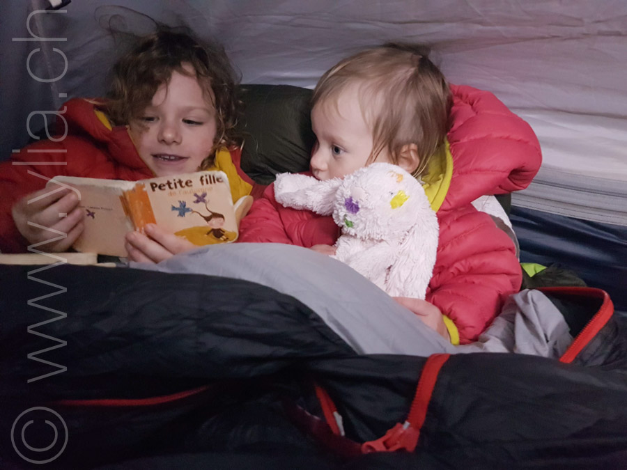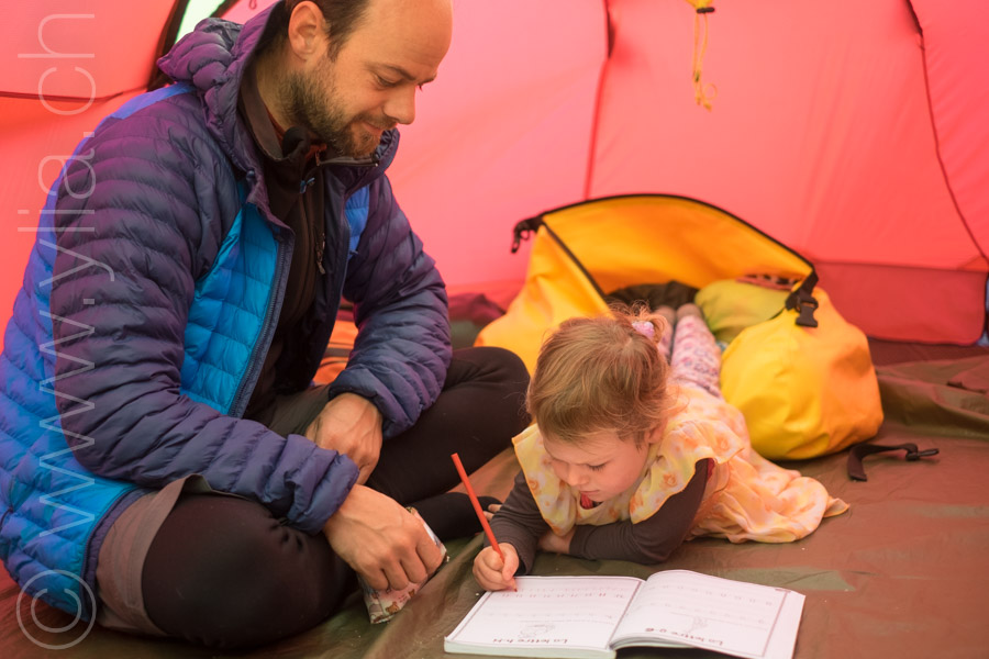 Nomades, nous offrons à Nayla et sa soeur Fibie des outils pour créer leur vie. Nayla nageait à 2 ans. Elle faisait du vélo et skiait à trois ans. La danse est sa plus grande passion. Nous leur apprenons à respecter leur corps en faisant du yoga et les invitons à méditer. Maintenant, Nayla est censée aller à l'école, ainsi nous avons choisi faire de faire confiance au processus naturel d'apprentissage. Parfois, nous créons de l'art éphémère au milieu d'un champ, nous peignons devant les montagnes, nous apprenons à écrire à l'intérieur de la tente. Mais en réalité, tout est une excuse pour apprendre, même pour nous.