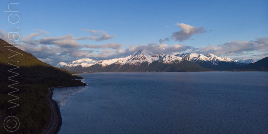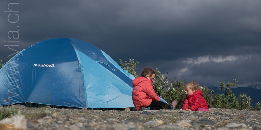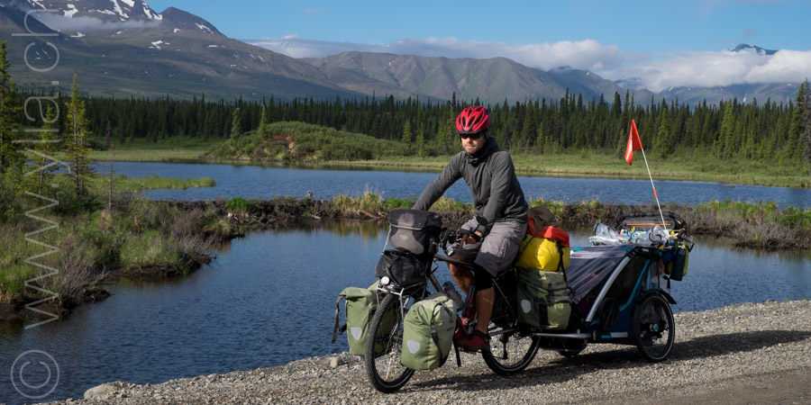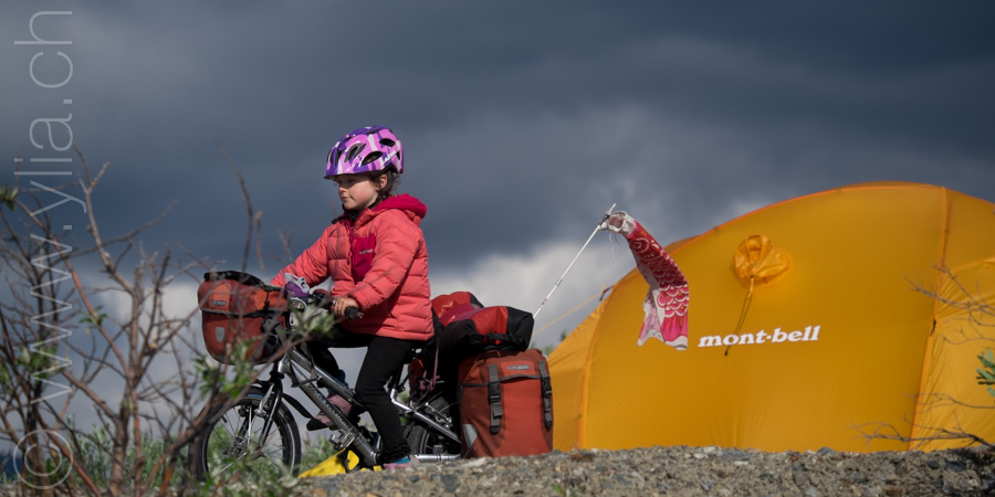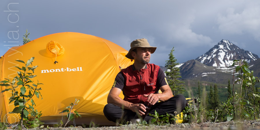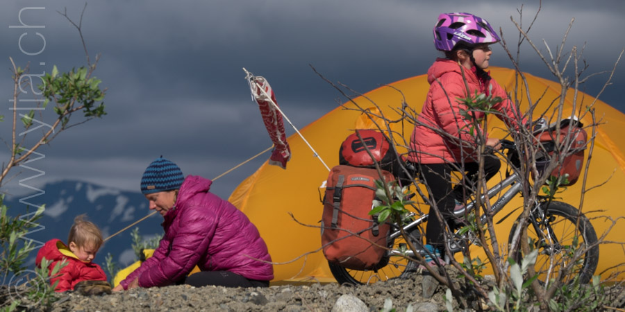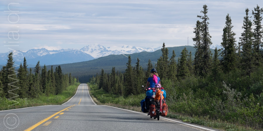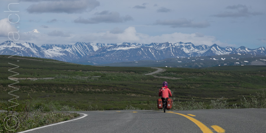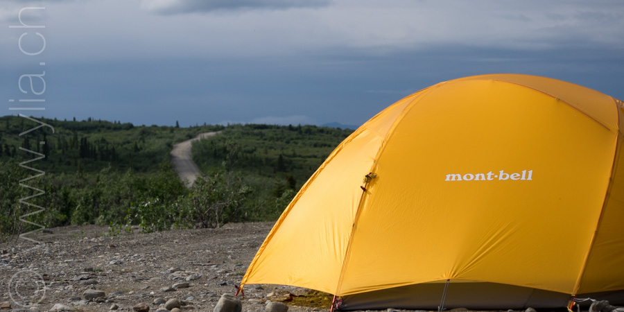 Nous portons désormais deux tentes, une pour dormir et une pour manger en cas de mauvais temps ou comme protection contre les moustiques. Cette dernière se révélera indispensable dès les premiers jours. Accueillis par un ciel bleu le long du Cook Inlet face aux montagnes Chugach, le temps change rapidement. Nous sommes baignés sous une pluie glaciale alors que nous roulons à côté de la neige, les sommets couverts dans un voile blanc.