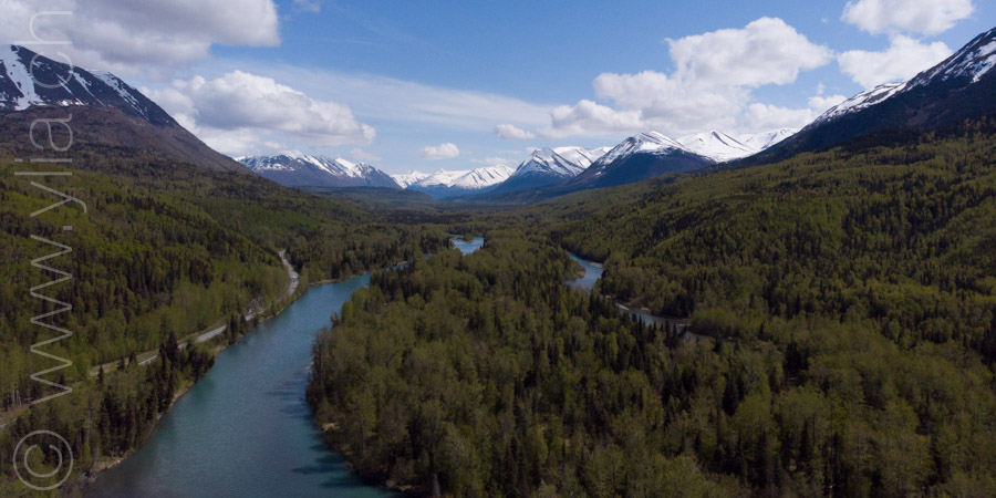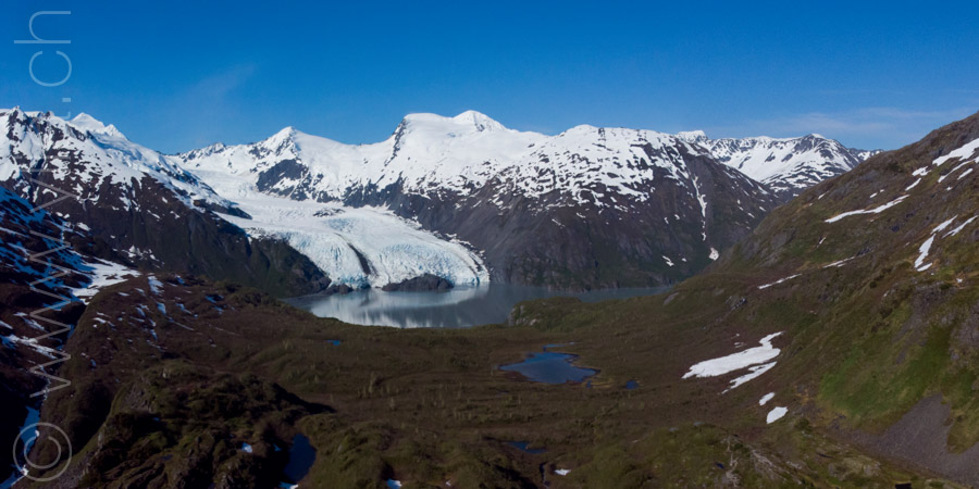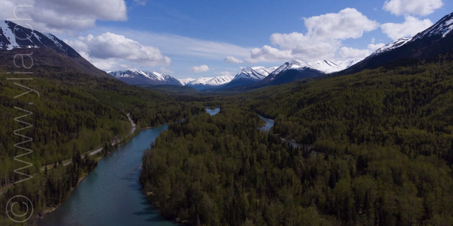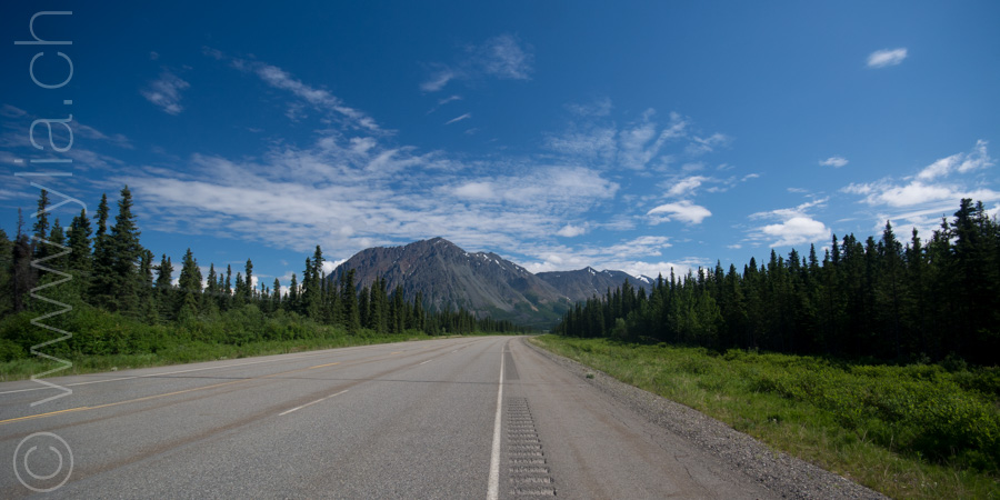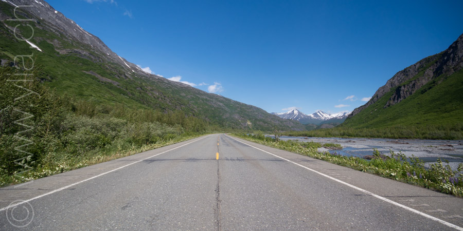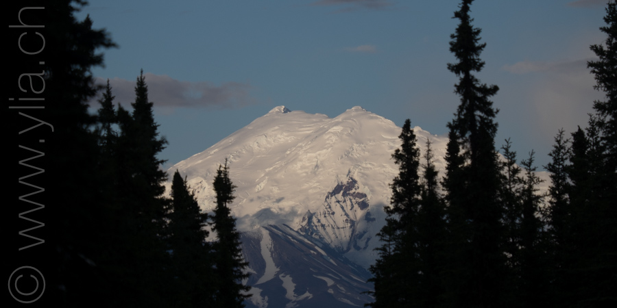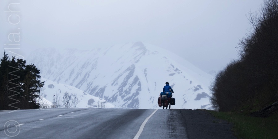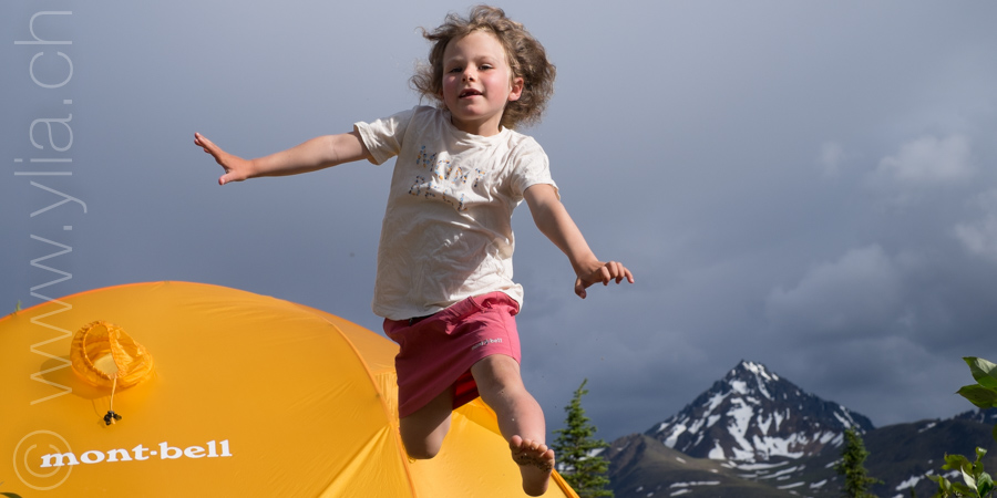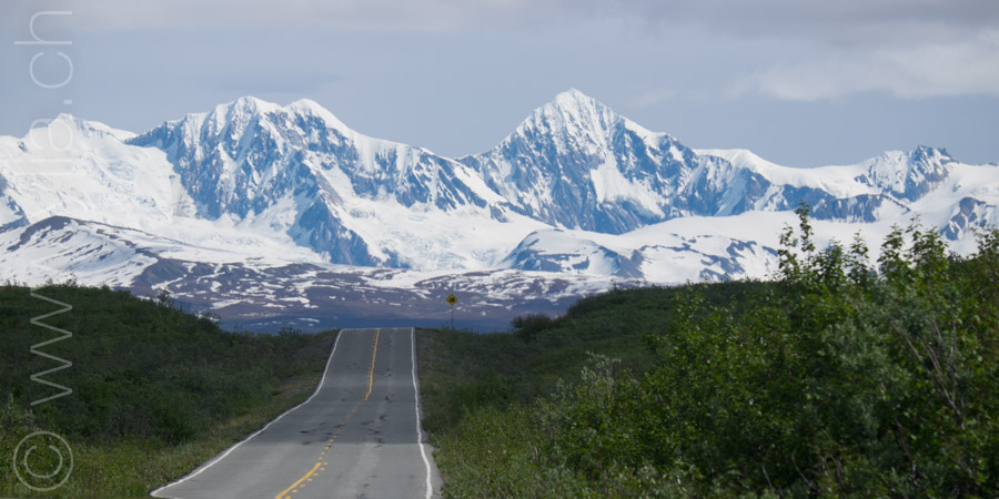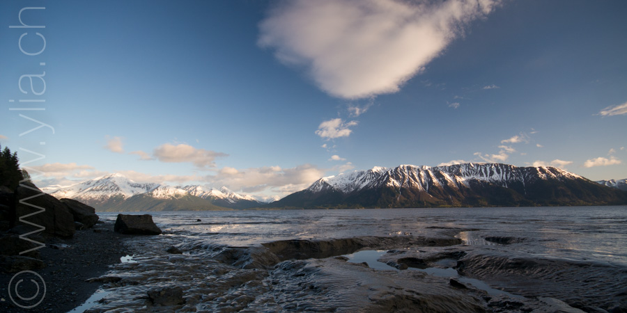 Nous portons désormais deux tentes, une pour dormir et une pour manger en cas de mauvais temps ou comme protection contre les moustiques. Cette dernière se révélera indispensable dès les premiers jours. Accueillis par un ciel bleu le long du Cook Inlet face aux montagnes Chugach, le temps change rapidement. Nous sommes baignés sous une pluie glaciale alors que nous roulons à côté de la neige, les sommets couverts dans un voile blanc.