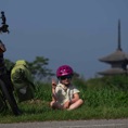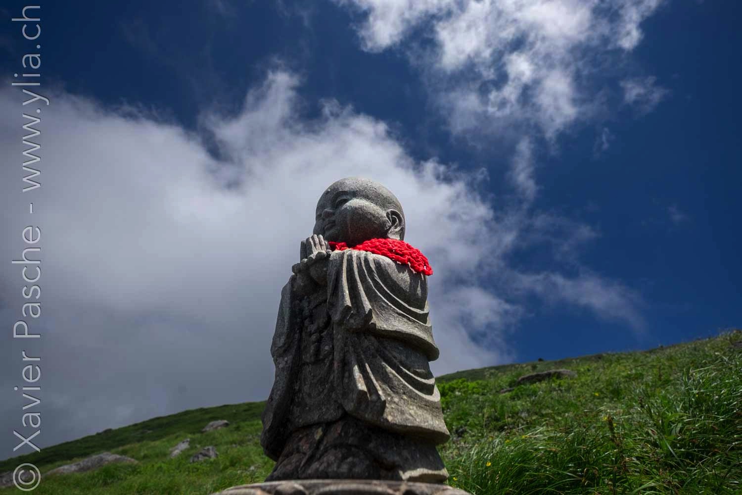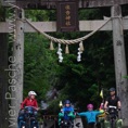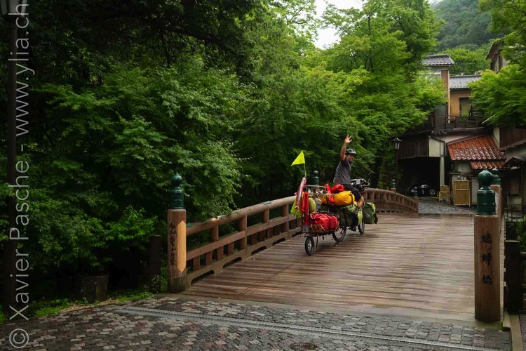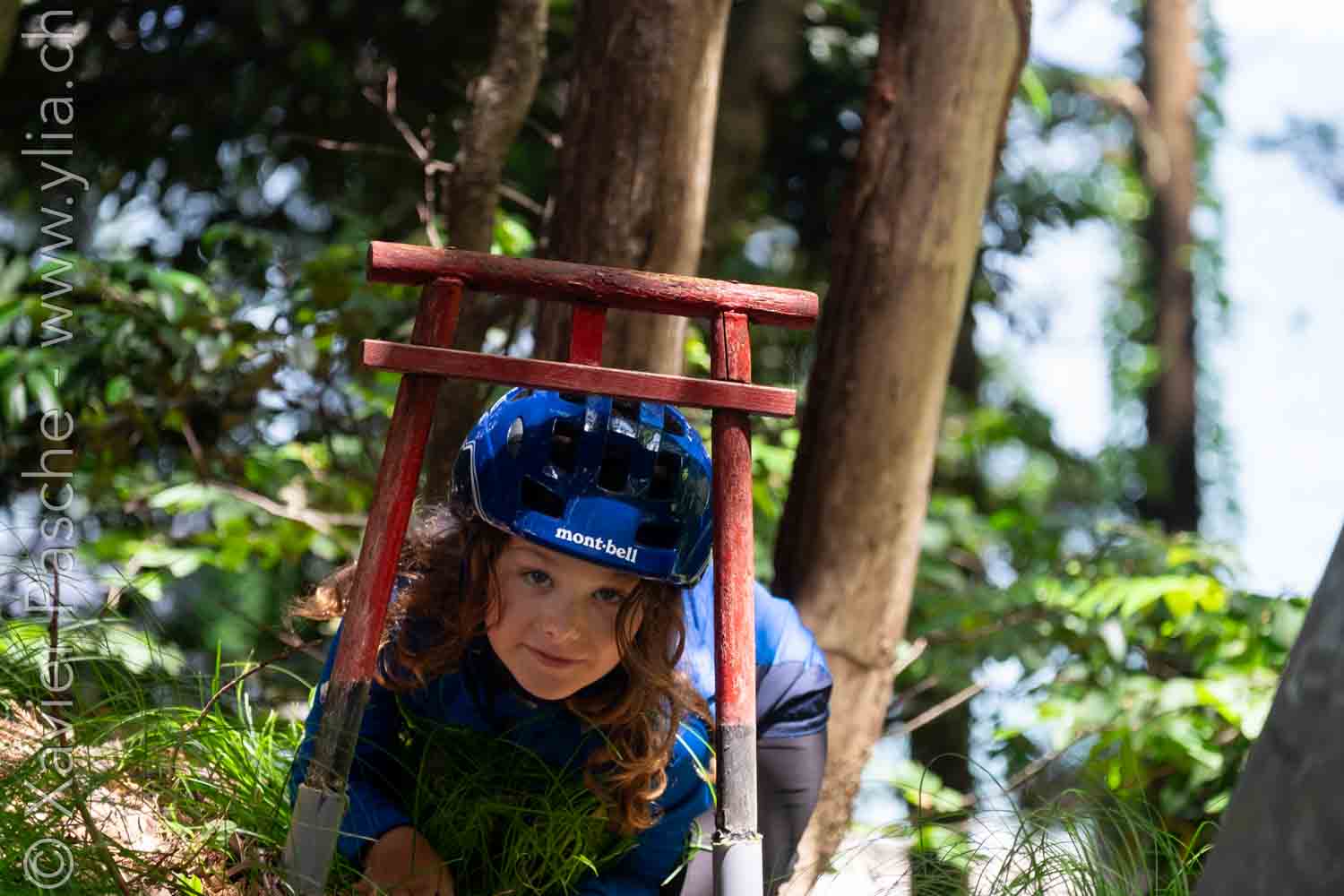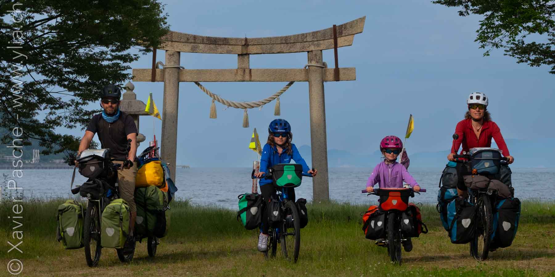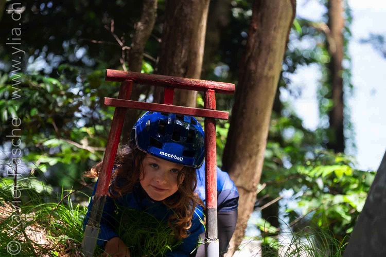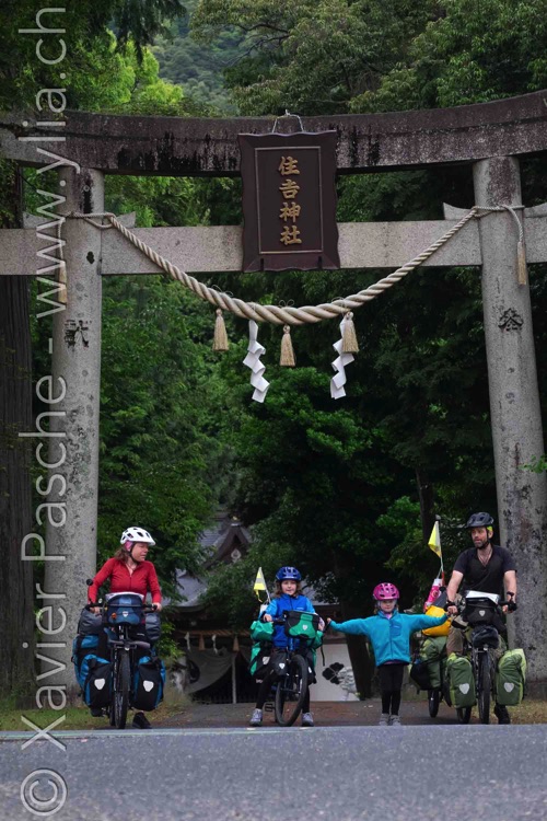 Nous longeons cette côte accidentée dans des cols à n’en plus finir. Heureusement, les points de vue nous offrent des paysages spectaculaires sur les petits villages traditionnels de pêcheurs. C’est surtout l’odeur délicieuse du jasmin qui en reste le symbole. C’est ici que Nayla fête ces 10 ans, sur une plage à côté d’un Torri qui s’ouvre sur l’infini et d’une lanterne en pierre. Avec en plus la joie de plonger dans la mer. Pénétrant dans les terres, Fibie découvre ces premiers châteaux et surtout les petits temples bouddhistes ou les sanctuaires shintoïstes qui ponctuent notre chemin. Ils sont ces lieux magiques, inspirants, cachés, purs, élégants, qui nous offrent une petite pause, parfois à côté d’une forêt de bambou.