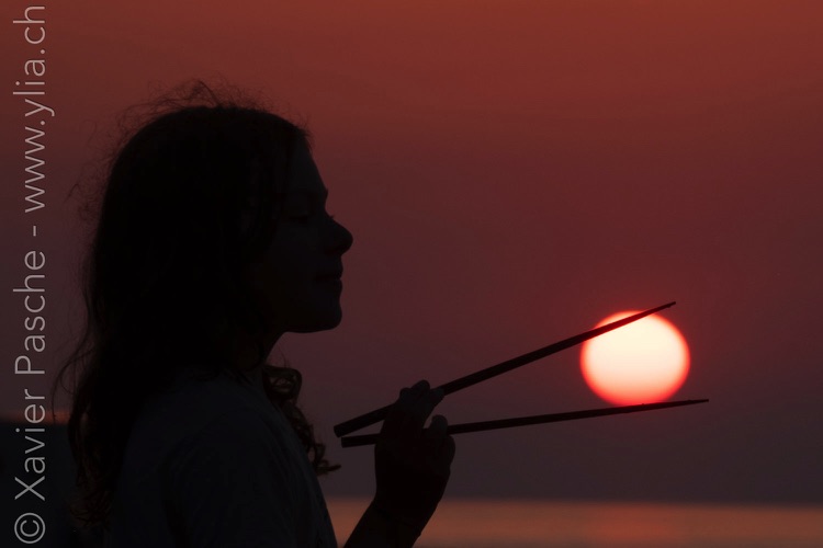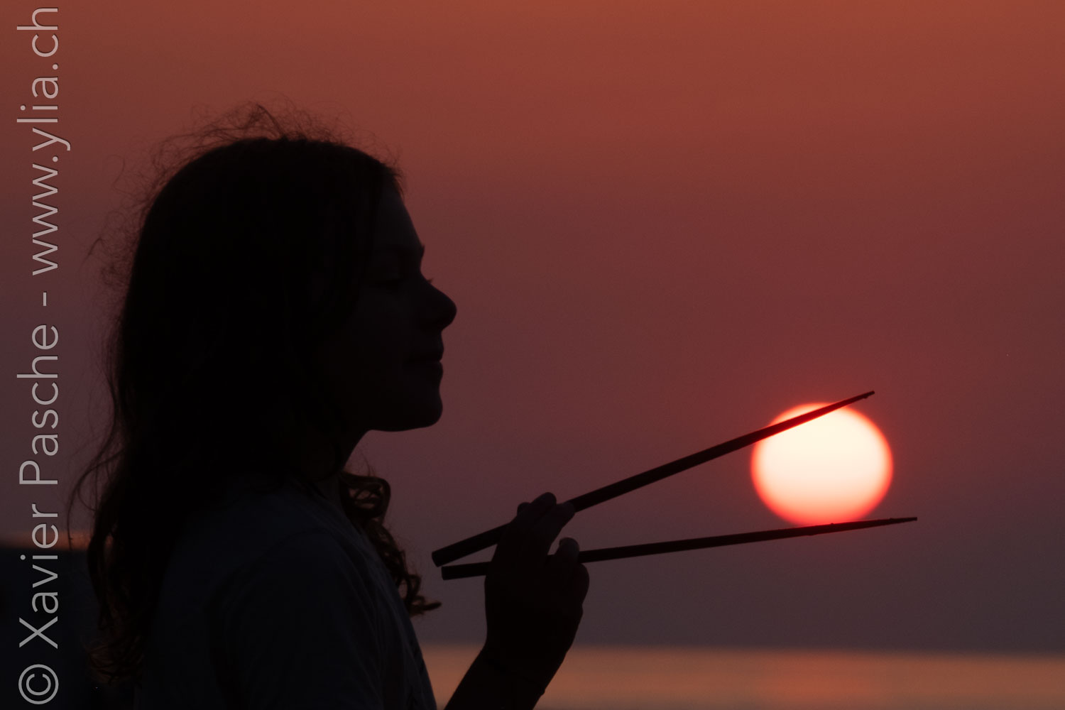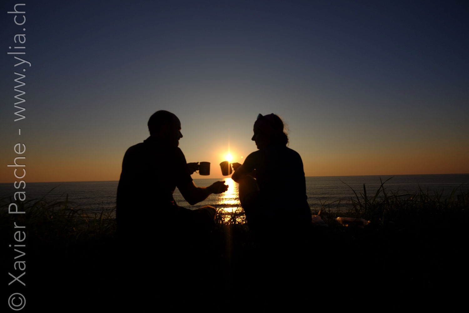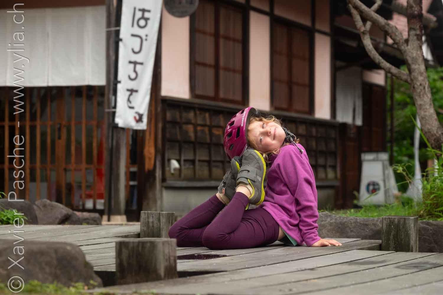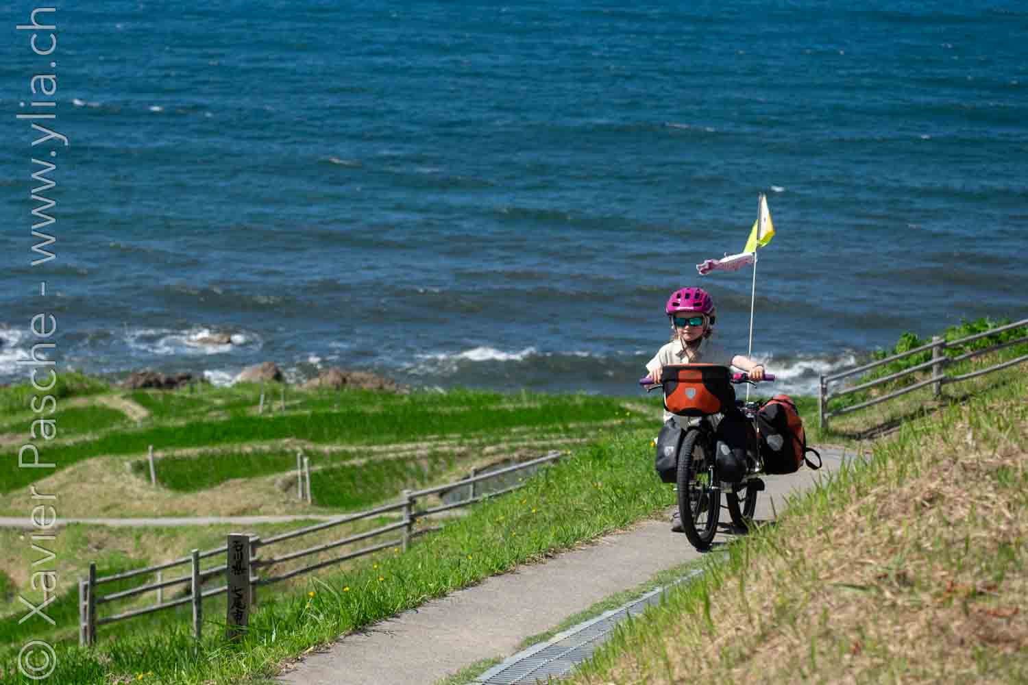 Nous plongeons dans le vert infini du Japon et de ses collines. Nous campons à côté des rivières et nous nous y baignons. Nous découvrons même une chute d’eau sous laquelle Nayla va spontanément se doucher ! Puis nous rejoignons à nouveau la côte et roulons autour de la péninsule de Noto, celle dont nous avions tant entendu parler. Nous roulons durant plus de 8 km le long de la plage, euphoriques de faire la course avec les vagues. Nous découvrons les marchés aux pieuvres séchées, les villages de sel qui utilisent encore aujourd’hui les méthodes traditionnelles pour extraire le sel de mer, puis les rizières en terrasses qui ont ponctué le paysage japonais depuis des siècles. « Des dauphins » Fibie hurle après avoir perdu sa première dent. Leurs sauts nous apportent l’énergie malicieuse du jeu et de la légèreté !