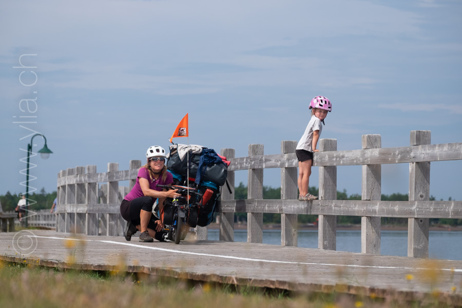 We discover the velo route of the Acadian Peninsula. This is where we celebrate our 80'000 km on the roads of the world. A symbolic figure in this nomadic life. For Nayla, it's already 43,000 km. Fibie has been a nomad for 18,000 km, mostly in the heart of the wilderness. Here she is euphoric because she can finally cycle on her own to discover this land surrounded by the sea. On one side, the warm waters of the Baie-des-Chaleurs and on the other, the Gulf of St. Lawrence and its exceptional marine life.