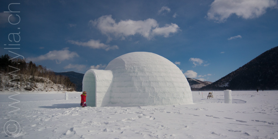 In the heart of Daisetsu National Park, on the Lake of the Sky, the lake Shikaribetsu, we enter an Ice Village. Here, on the highest mountain lake in Hokkaido appears igloos. They are built on the frozen lake in front of an indigo blue sky dotted with white clouds. Even a chapel was created in ice.