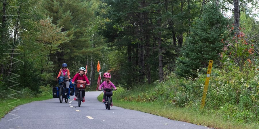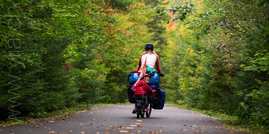We take "les routes vertes" of Quebec, where Fibie can cycle. She is so excited that she rides 15 kilometers, and she is just three years old. She is so proud to be on her bike and excited to be able to ride for such a long time. The climbs are tiring, so we enjoy lots of small breaks. At just three years old, she is riding her bike and now she is swimming too!