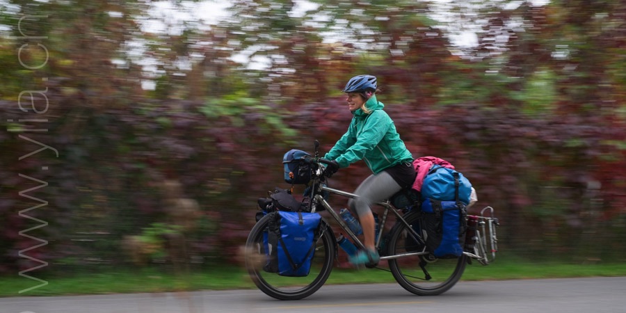 Every day, the colorful trees are becoming more and more naked. The power of the wind speeds up the process. In the early morning, the air is now bitterly cold. It is -8°C. Our water bottles are just a big ice cube and the fog has created beautiful frost formations on our bikes and panniers.