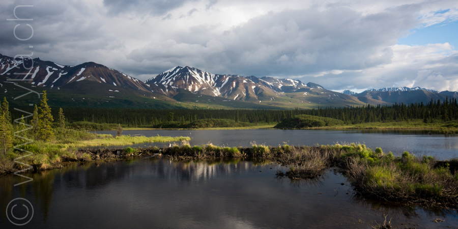 Their presence alone leads us to change our routine. We now have two tents, one for sleeping and one for eating in case of bad weather or as protection against mosquitoes. The latter will prove essential from the very first days. Welcomed by a blue sky along the Cook Inlet facing the Chugach Mountains, the weather is changing rapidly. We are bathed in freezing rain as we cycle beside the snow, the peaks covered in a mist of white veil.